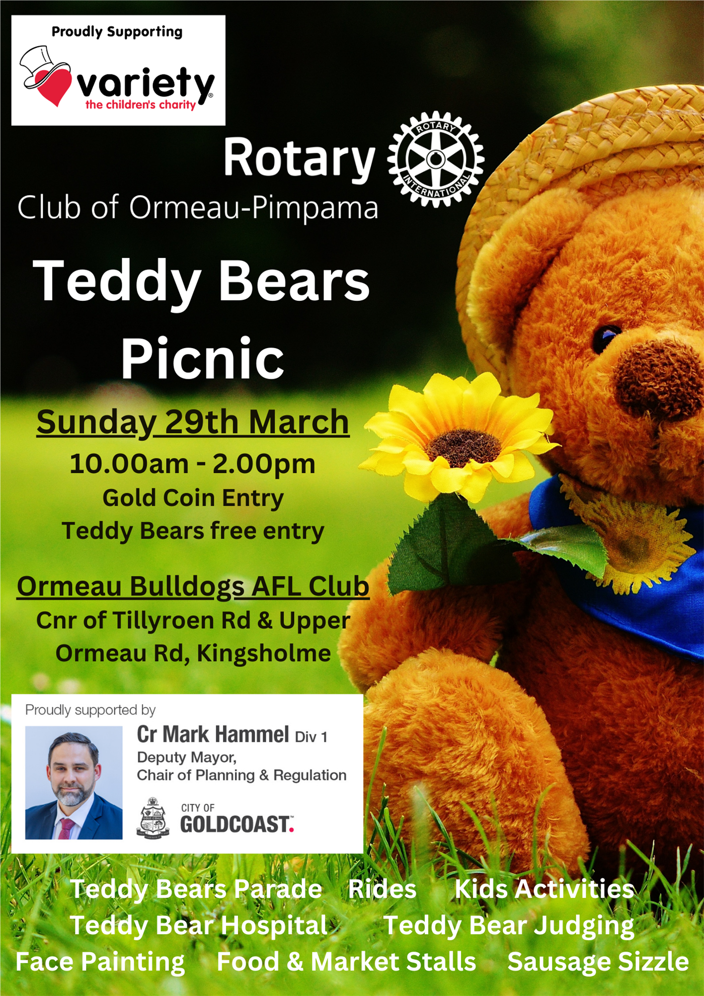 This year the Rotary Club of Ormeau-Pimpama is continuing with the annual Teddy Bears Picnic. The event will be held on Sunday 29th March at Ormeau Bulldogs AFL Club and will support this years nominated children's charity Variety - The Children's Charity of Queensland. Come along and support this wonderful cause and have a day of fun with the whole family.